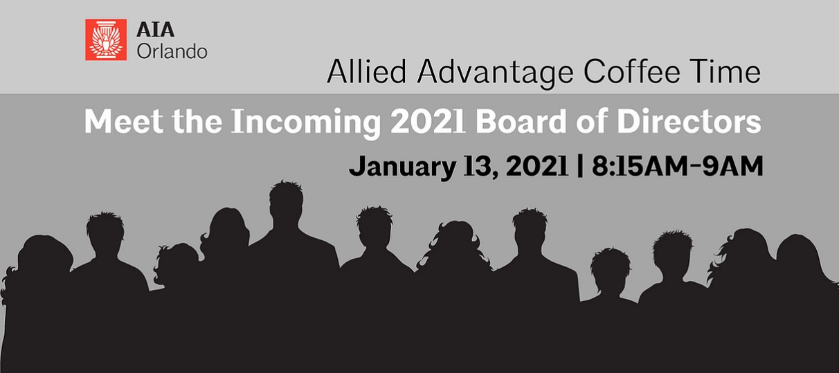 This month, we will be kicking off the new year by meeting the incoming 2021 AIA Orlando Board of Directors. Board members will be present to introduce themselves and answer questions. “Meet the Board” will be held from 8:15-9:00. This will be followed immediately by the first Allied Committee.