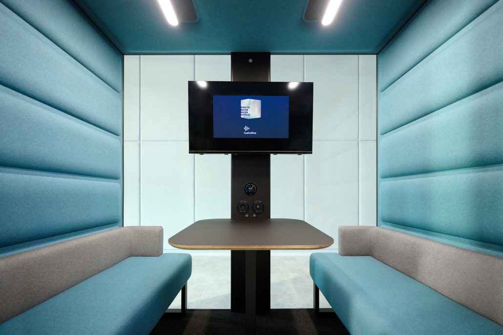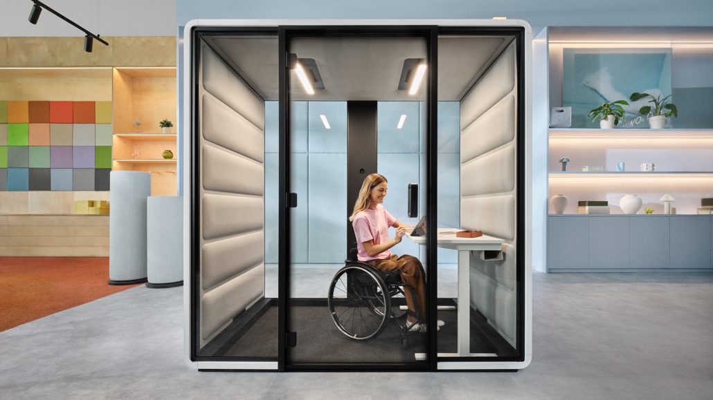 HushFree.Access.M is an ADA-compliant acoustic booth with a low threshold and wider door, designed to be more easily accessible for people with disabilities than the hushFree.M booth. With room for 1-4 people and a customizable interior, the hushFree.Access.M pod is a flexible solution to create acoustic privacy in the office.