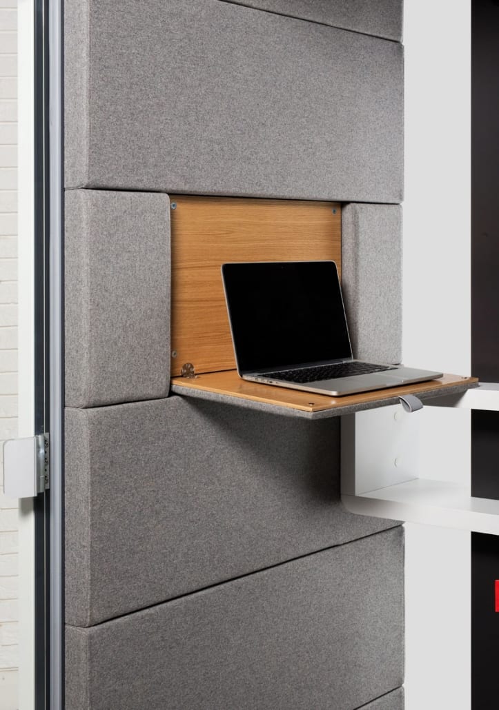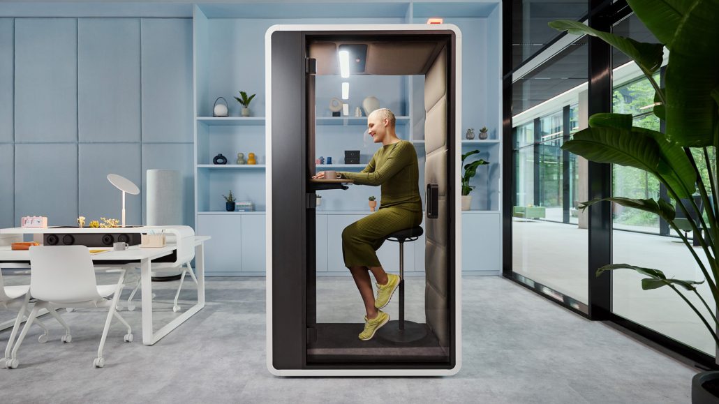 HushFree.S is a single-person acoustic booth designed for focus work and video calls. It can be equipped with a sofa, stool, or chair, and users can adjust the desk height to stand comfortably as well. With integrated casters, hushFree.S is easy to move within a floorplate, and it’s a cost-effective solution to improve office acoustics.