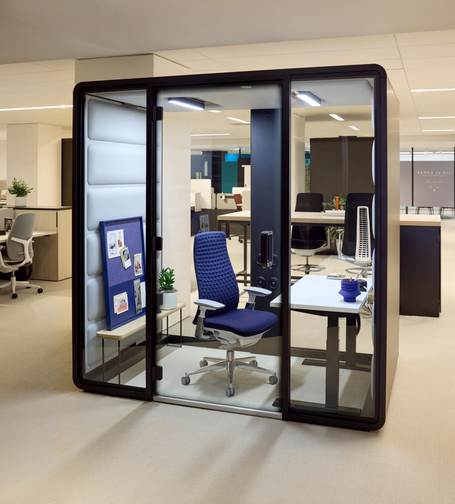 HushFree.M is an acoustic pod designed for groups of 1 to 4 people. It’s ideal for private conversations, group meetings, or focus work within open office floorplans. HushFree.M booths can be personalized with different interior tables, seating, and panel colors to fit an existing aesthetic. There is also an ADA-compliant option available, the hushFree.Access.M.