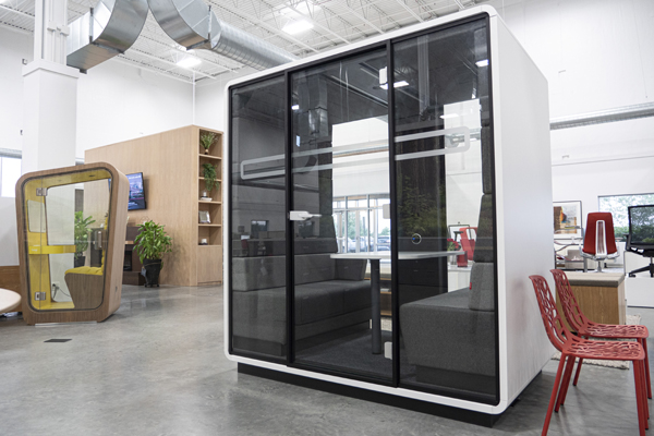 HushFree.L is the largest acoustic pod in the hushFree product line, designed to be an alternative to traditional conference rooms. Because it’s easy to install and move, it’s a cost-effective option relative to traditional construction methods. HushFree.L booths provide acoustic privacy and many customization options. There is also an ADA-compliant booth available, the hushFree.Access.L.