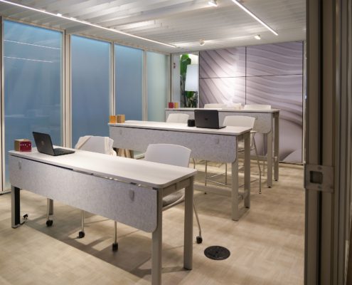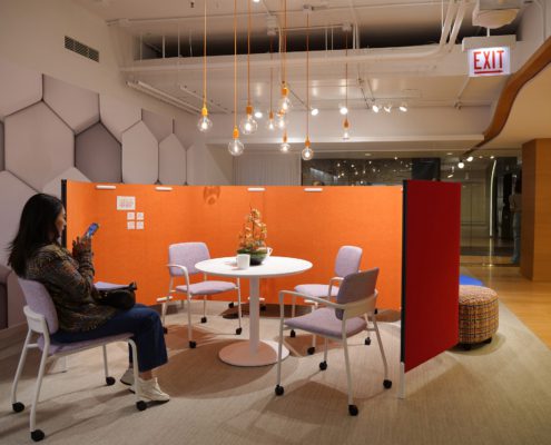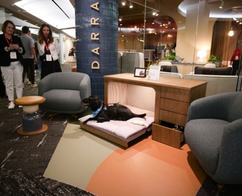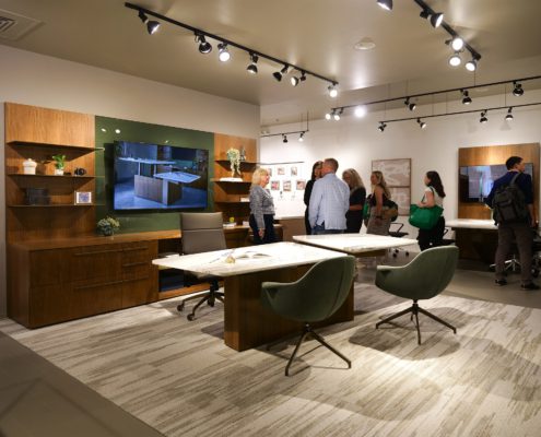 “NeoCon 2025 showcased a clear shift toward flexible, human-centered design, with modular walls and privacy booths taking center stage. “Room within a room” solutions like Haworth’s Enclose, Trivati, and 4Space systems, along with offerings from Hush and BuzziSpace highlighted the demand for scalable, acoustically sound spaces that adapt to evolving workplace needs. While many vendors embraced this direction, Haworth stood out for offering the most comprehensive, vertically integrated architectural platform. Light hardwoods and soft pastels (hallmarks of Danish modern design) dominated color palettes, reinforcing the trend toward residential warmth in commercial interiors. Integrated technology focused less on novelty and more on enhancing user experience through intuitive lighting, AV, and environmental controls. Sustainability was not just a theme but embedded in the products themselves; modular systems like Trivati and 4Space are inherently demountable, reusable, and designed to reduce waste while supporting long-term adaptability.”