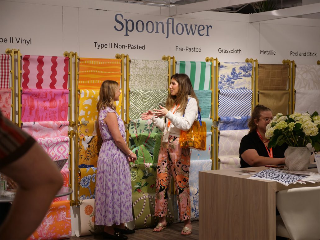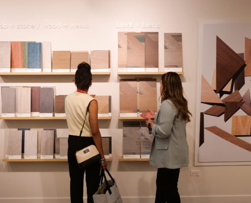 Earth tones, soft neutrals, and muted pastels dominated the color stories, with pops of forest green, deep blue, and burgundy providing contrast. Light woods and warm metals like bronze reinforced the shift toward residential warmth. -
