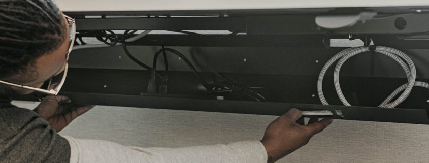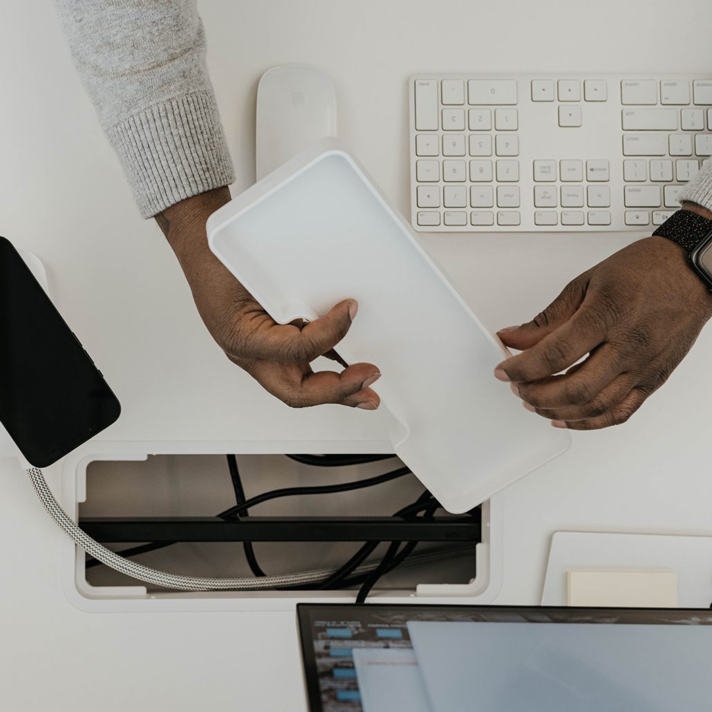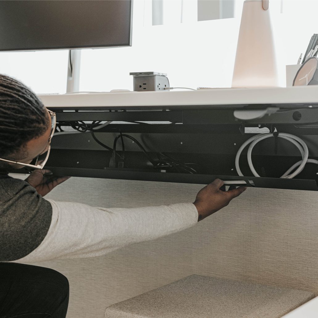 Organize cables underneath desks with Belong Wire Management, which neatly bundles charging and power cords. Belong Wire Management includes a tray that mounts below where you work, and the mesh cable manager and cord management cuff keep cords neatly bundled together.