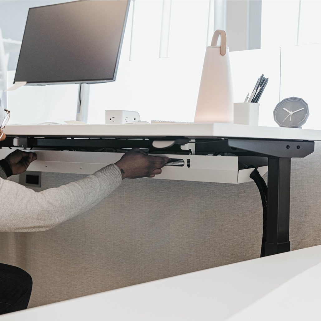 Move power and charging cords off surfaces with the Belong Hatch, a built-in desktop feature with a subtle cover. That reversible cover sits flush with the desk or workstation, providing access to a power strip, charging blocks, or a storage tray. Belong Hatch improves power cable organization and opens more space on your workstation.