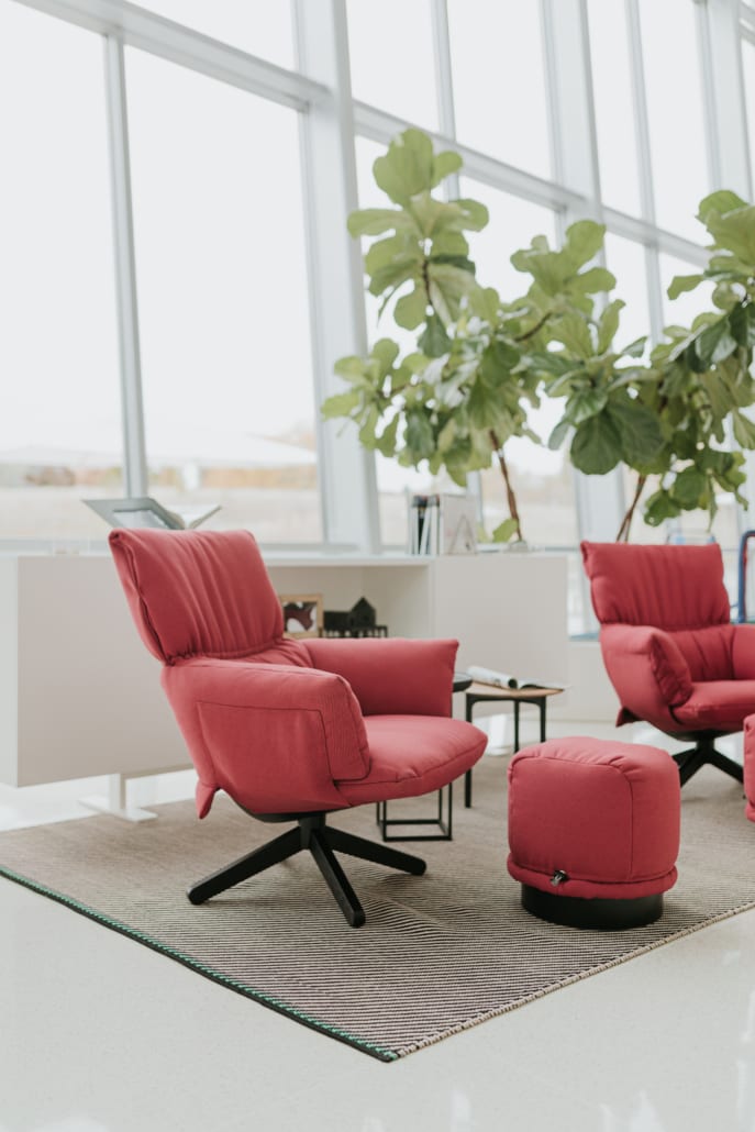 - Collection features a lounge chair and pouf