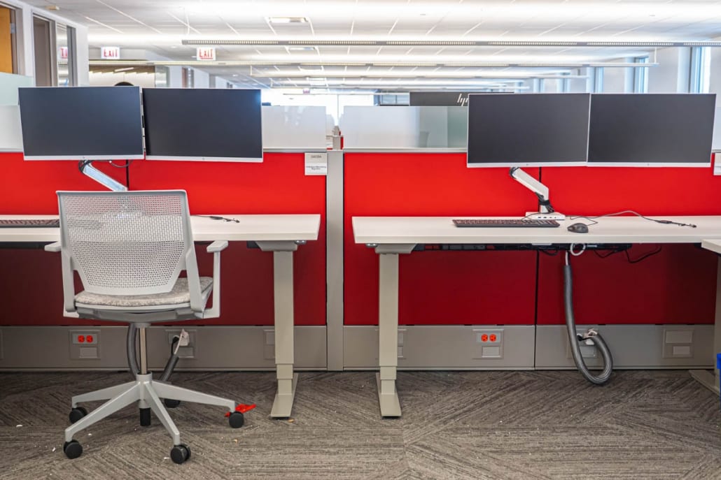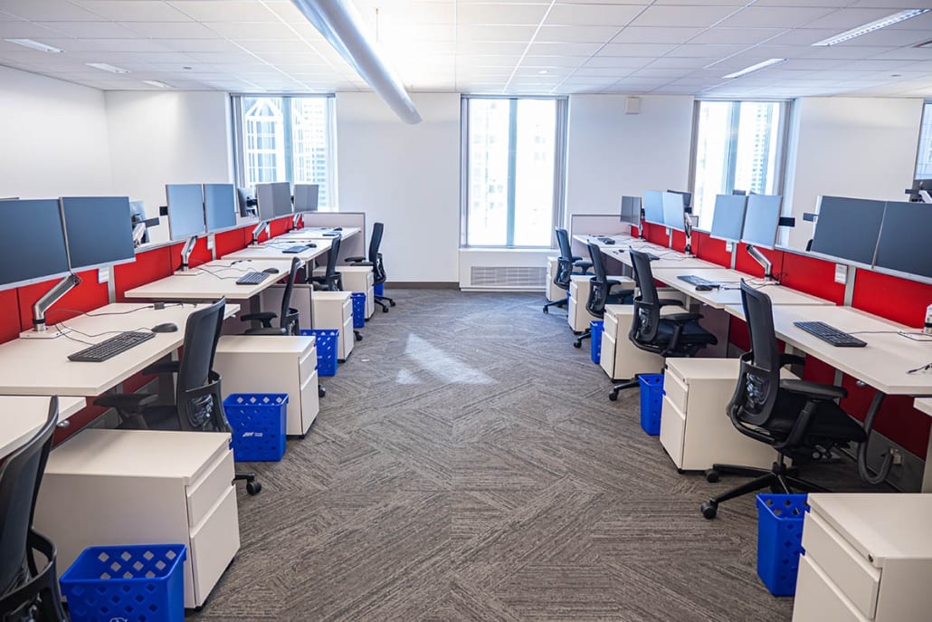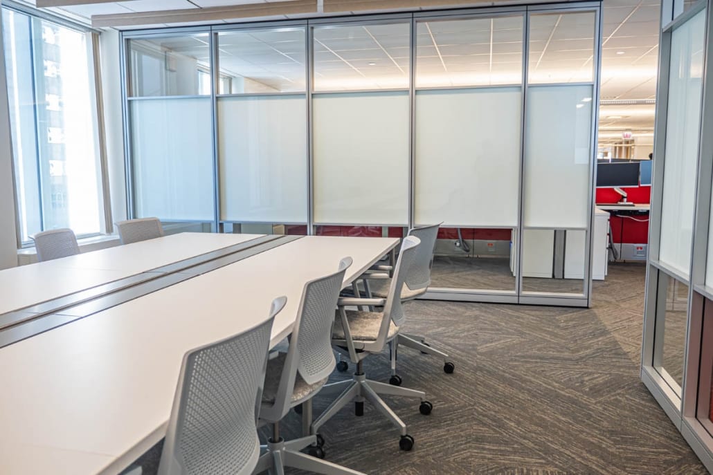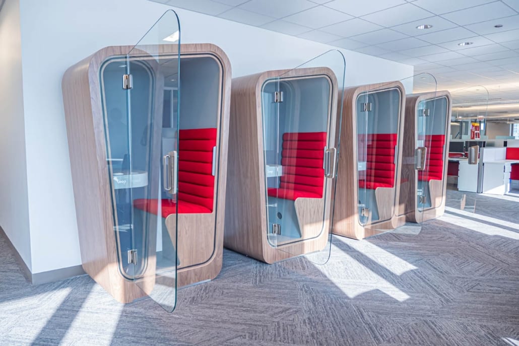 AON’s goal was to densify a floor and have free address. This was done by installing Haworth HAT desks, more huddle rooms, Loop phone booths and some open teaming areas.
