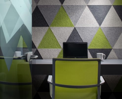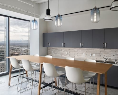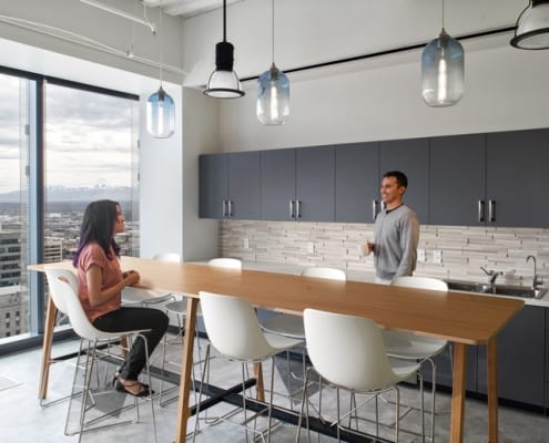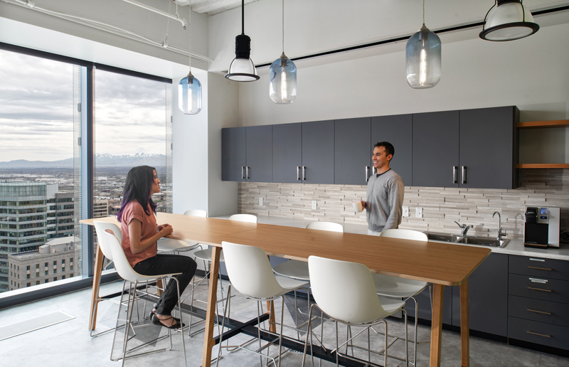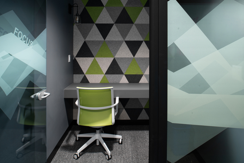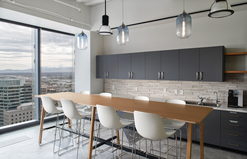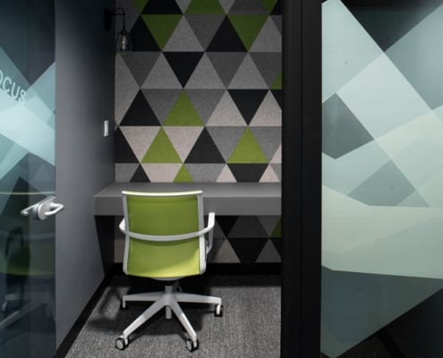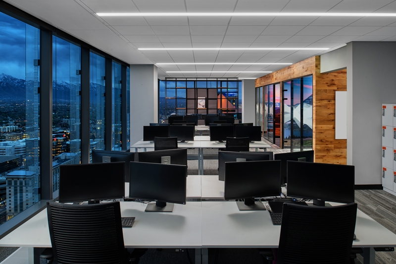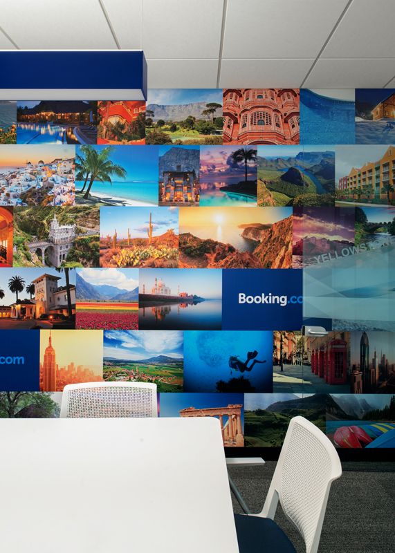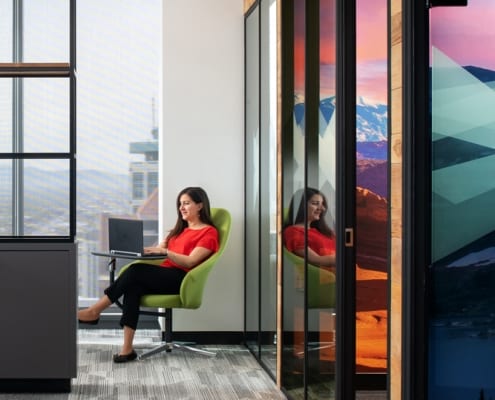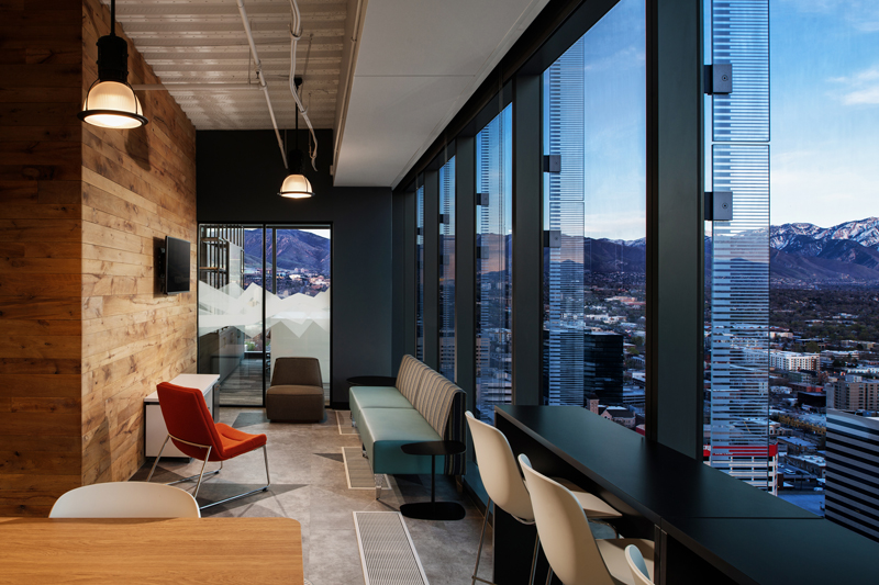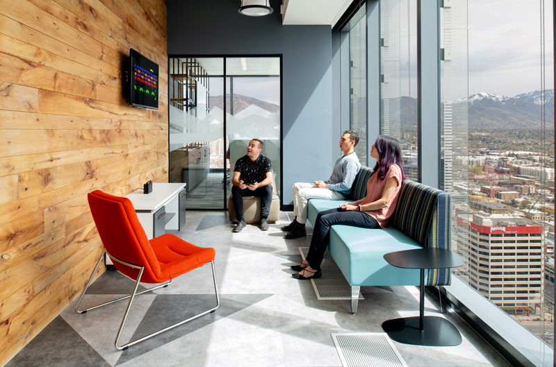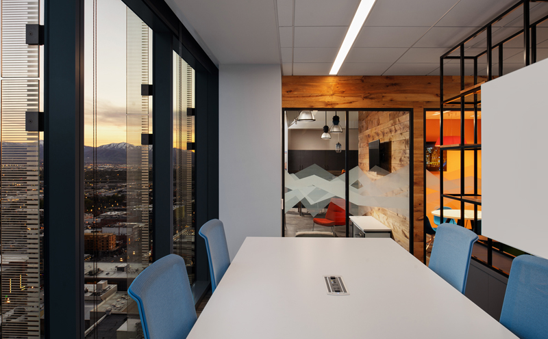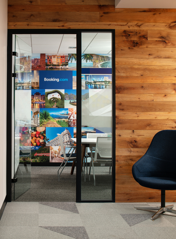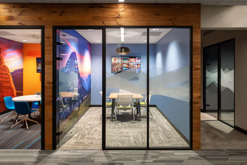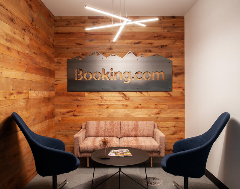 The unifying features of the wood walls, along with graphics and local photography, helped to drive the design intent of the furniture and fabrics. From the shared collaborative area with beautiful mountain views, to conference rooms designed around National Park images taken by their employees, the Booking.com SLC office has created a strong place identity for their growing team.