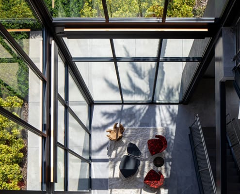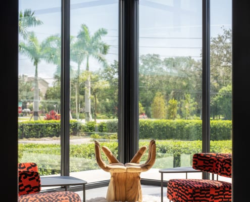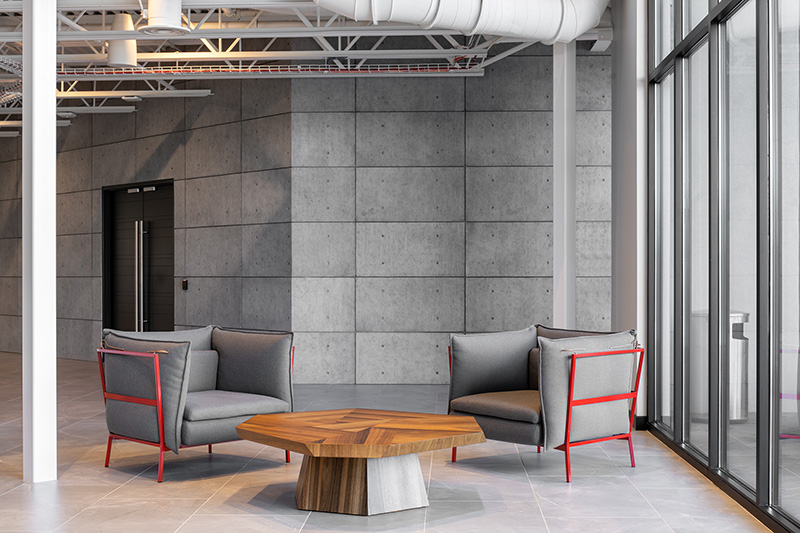 There is a lot of detail in this design work: from the red accents incorporating their brand in the main lobby space, to the cozy corner nook with great views, and the sleek sitting area off the main conference room with muted tones and textures. The connection to the outdoors, warm finishes, and the pops of the PDI brand colors certainly create an inspiring area for connection and recharging for their team members.
