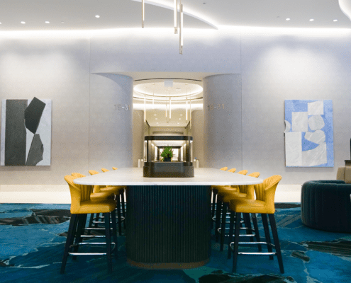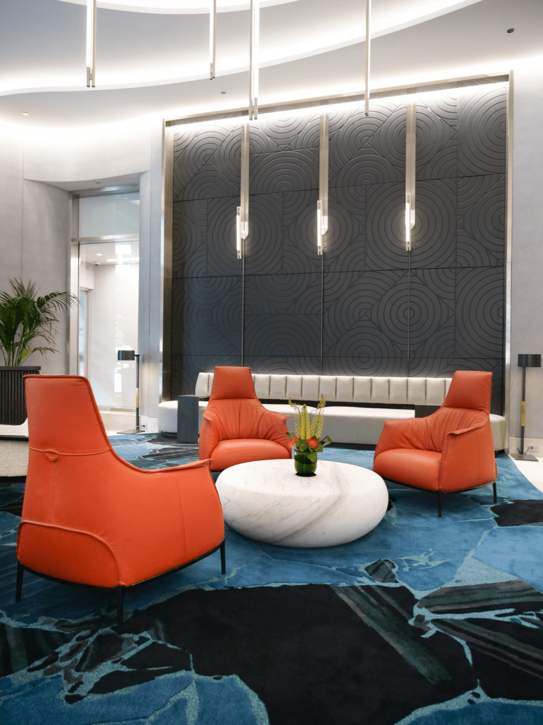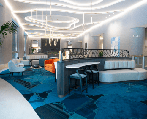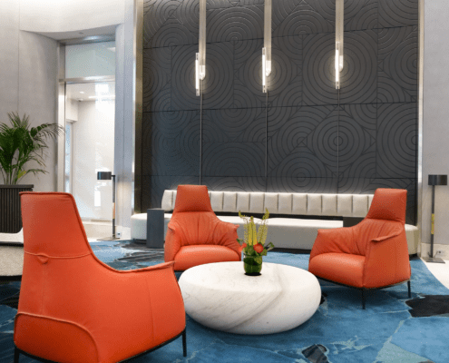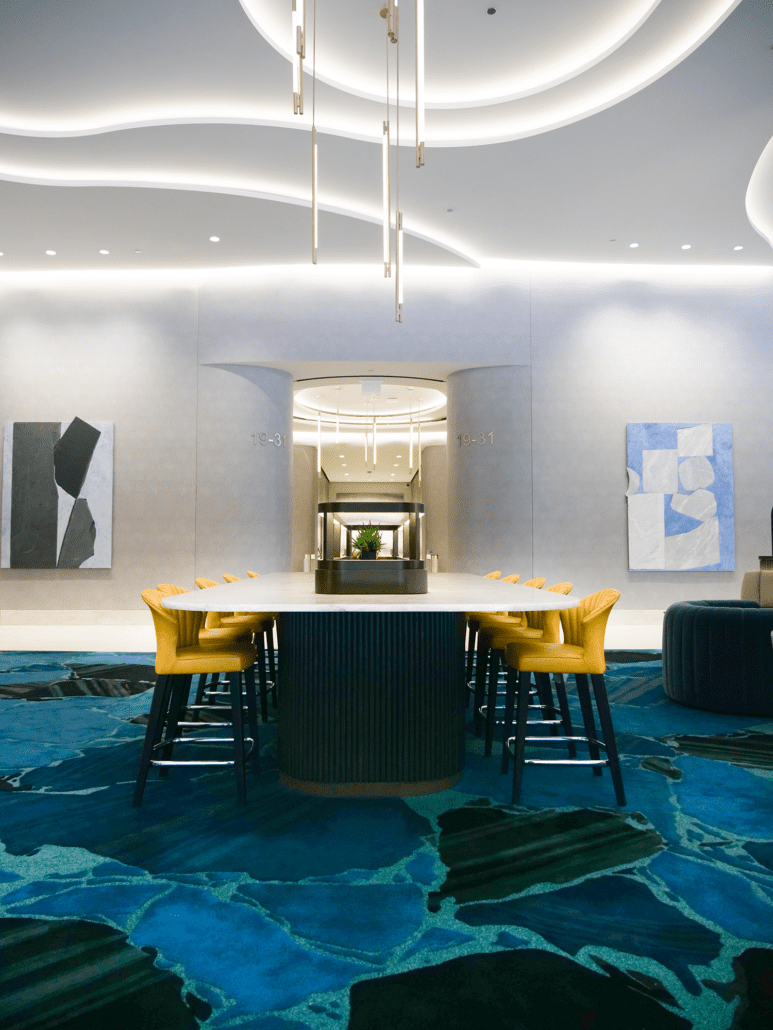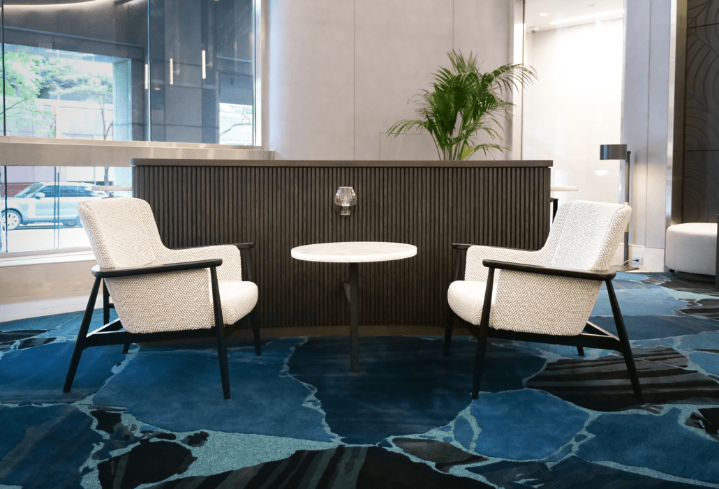 A standout element is the striking 1,000-pound marble occasional table from Italy, which lend a sense of luxury and uniqueness. With new architectural details, elegant wall coverings, and custom carpeting, the lobby now offers a sophisticated yet welcoming environment that leaves a lasting impression on all who enter.