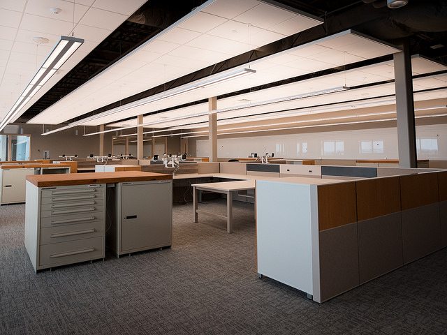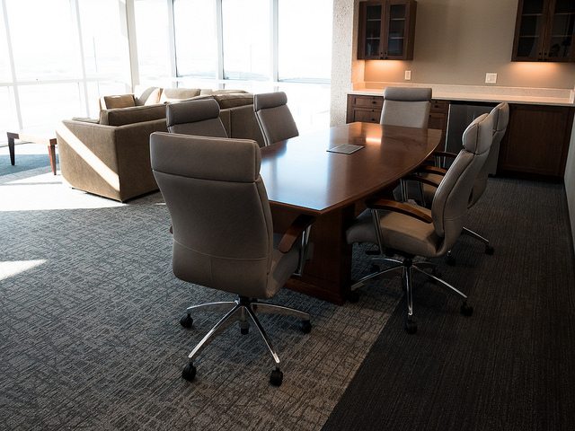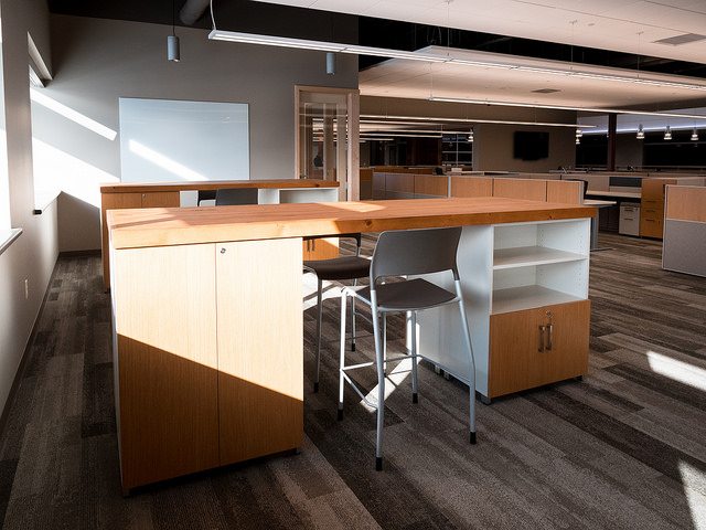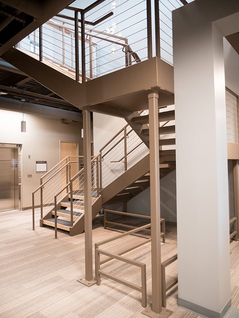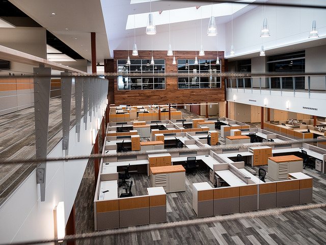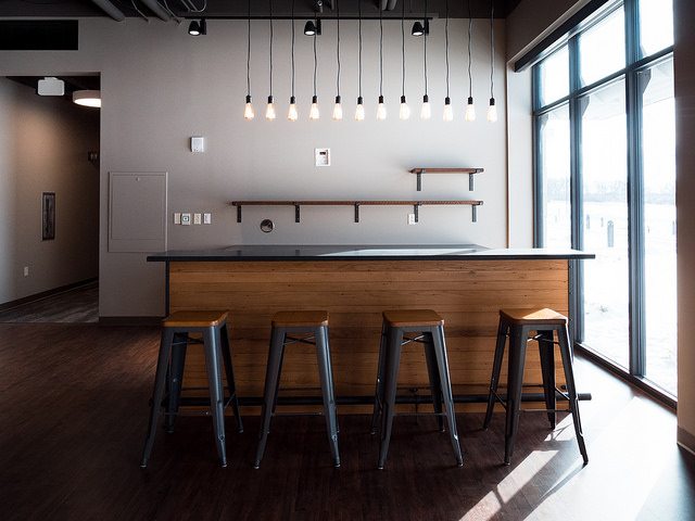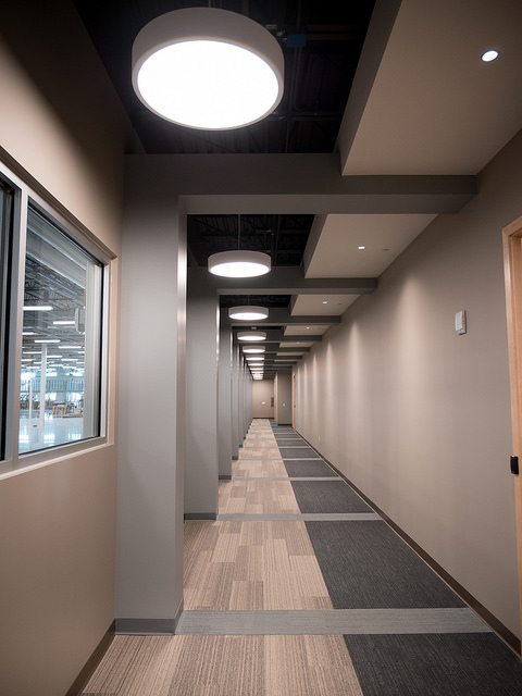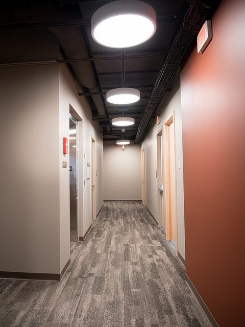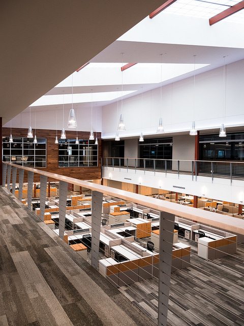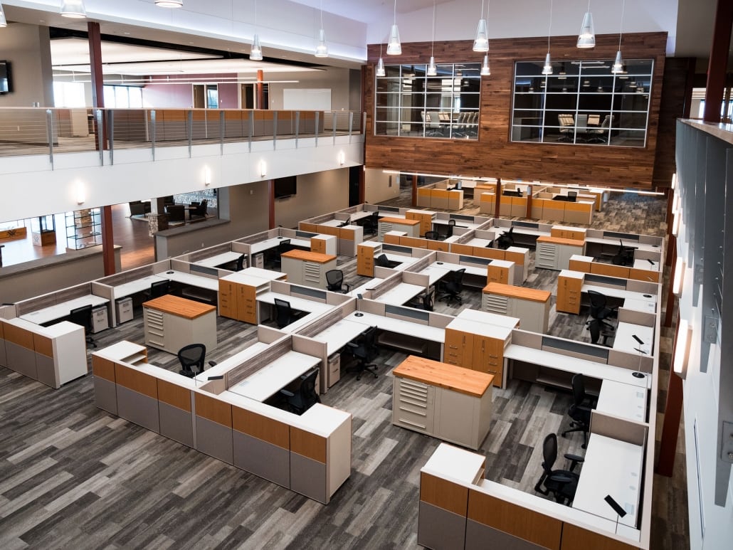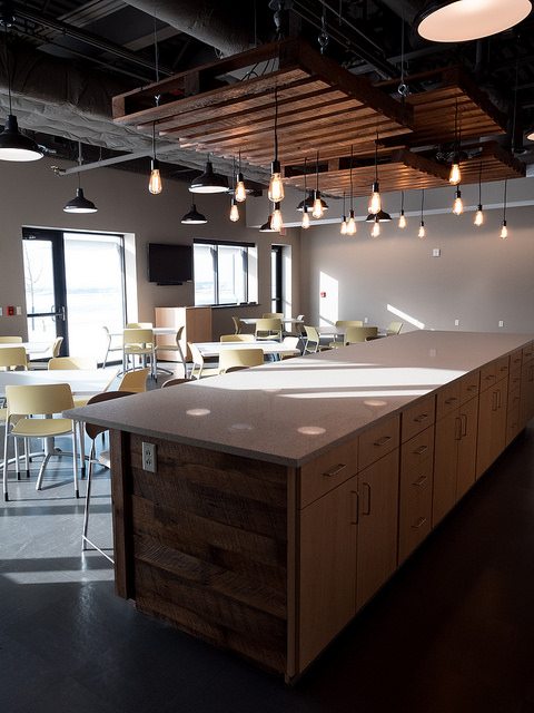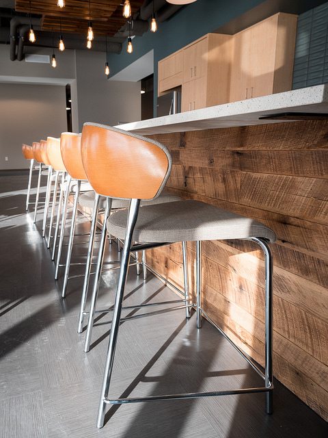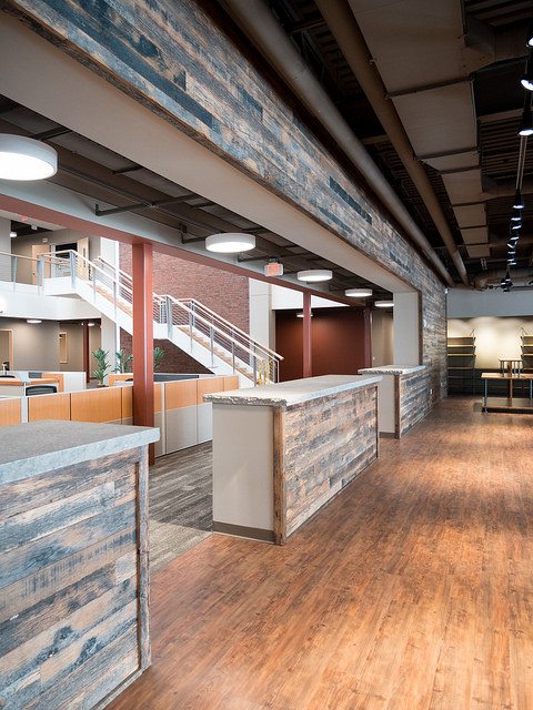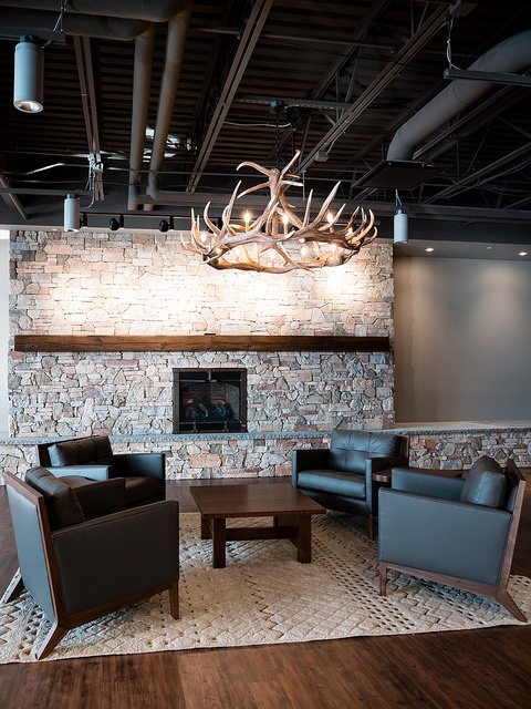Vortex Optics hired BOS Holdings early in the building design process to assist with design decisions and coordinate furniture choices and finish selections, integrating them into the design of the building. BOS Holdings installed all of the furniture in the space. The highlight of the space is the showroom that BOS Holdings designed, utilizing reclaimed wood materials to create the outdoor/lodge feel that they requested with an updated twist. We custom designed a 6,000 pound ceiling timber beam structure with 8×8 timbers sourced locally from Wisconsin. The “V” pattern with lighting gives a nod to the Vortex Optics logo. All of the display cabinets, and apparel displays were custom designed with reclaimed materials and metals, and have burnt in Vortex Optics logos. From the antler chandelier over the fireplace wall, to the custom coffee bar, this space gives a huge wow factor.