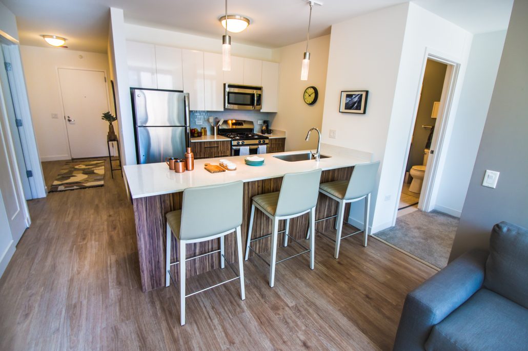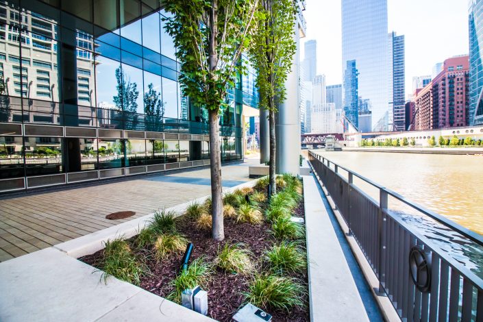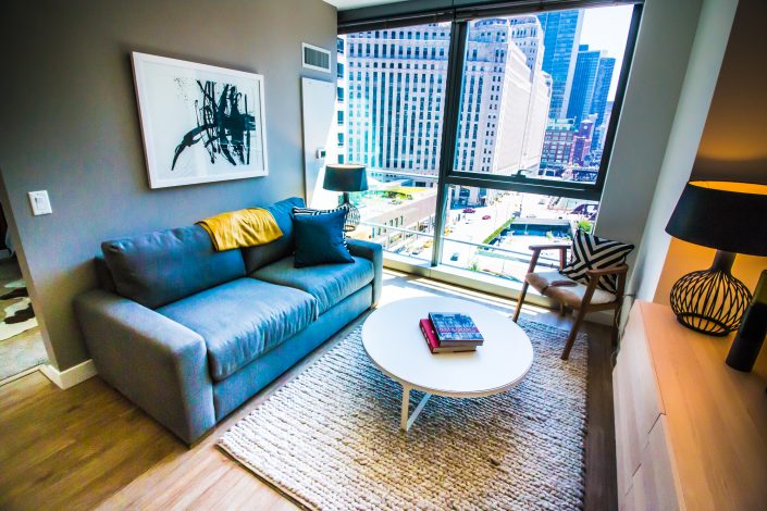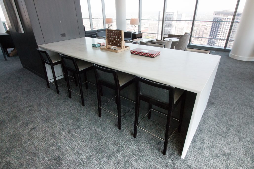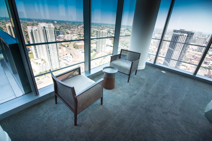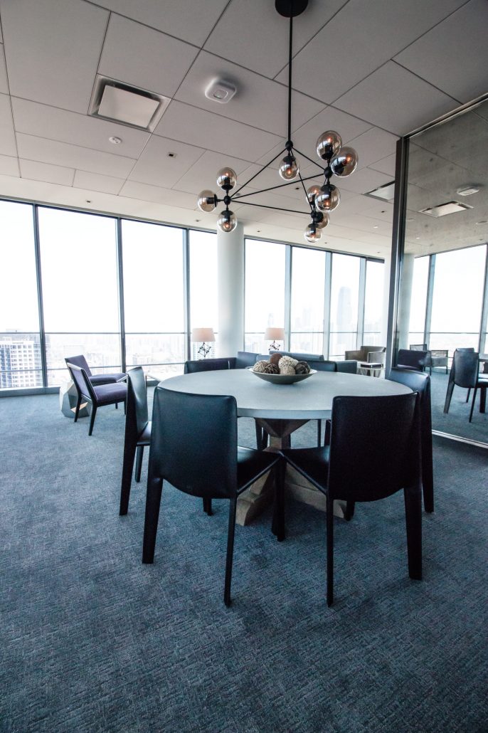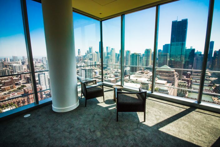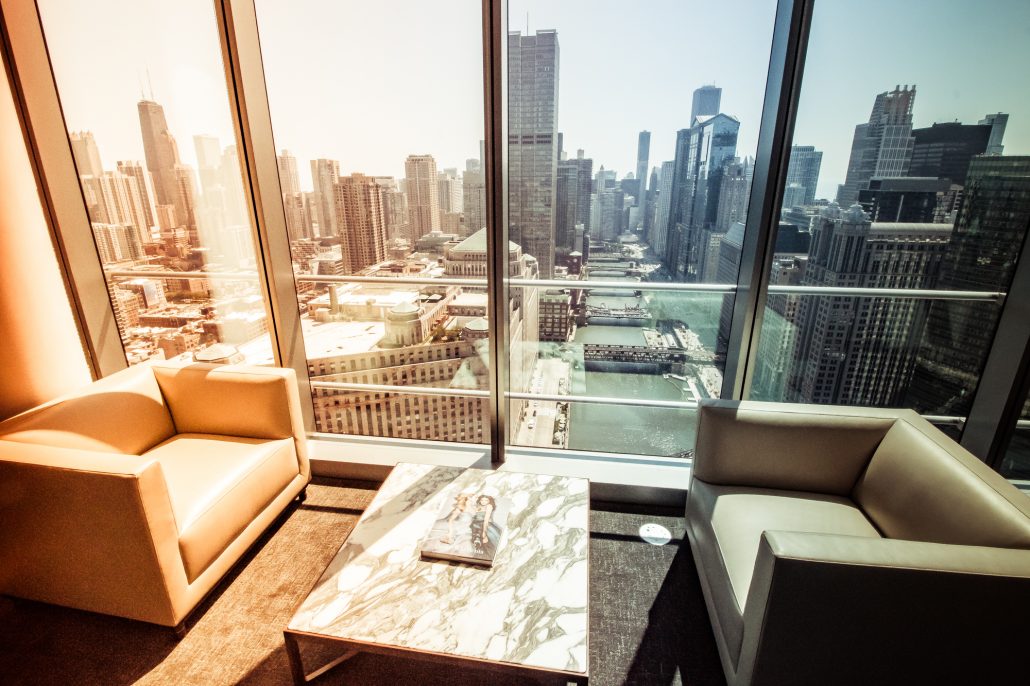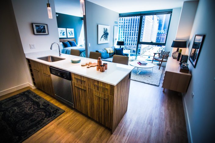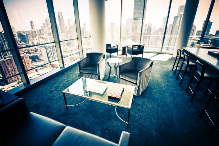 Elegantly responding to the confluence of the Chicago River, Wolf Point West’s design maximizes views in every direction rising 46 stories high. Residents will enjoy spectacular views from floor-to-ceiling windows, as well as inset balconies on select units. These brand new, stunning River North apartments feature refined architectural detailing with duotone, soft-close cabinetry, quartz countertops, undermount sinks and wood grained flooring. BOS furnished and installed common areas, business center, offices, and model units.
