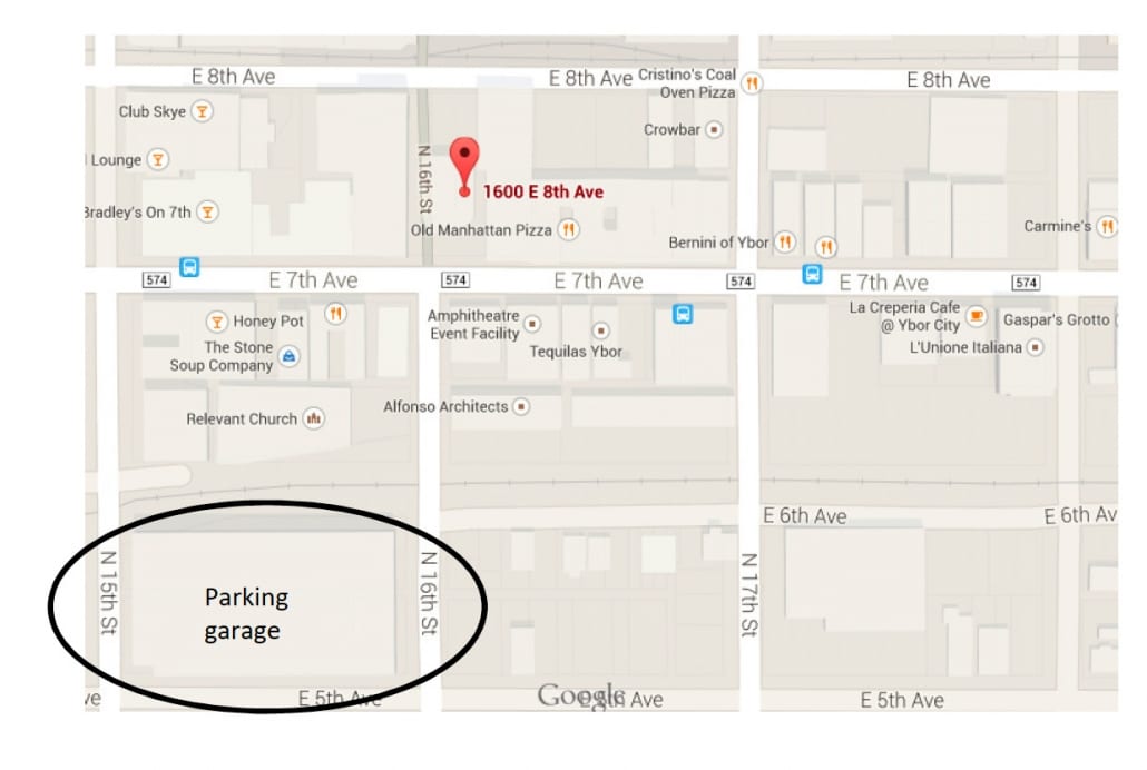 Our entrance door is on the first floor, just before the ticket window for Funny Bones Comedy Club. And parking is best in the Centro Ybor Garage on 16th Street, one block south of our office.